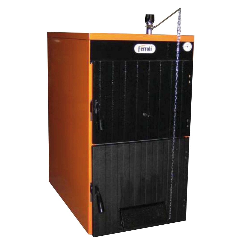 Корпус котла Ferroli защищен изоляционным слоем из минеральной ваты, которая закреплена специальным материалом, который вообще не рвется. Это сводит к минимуму потери тепла и повышает коэффициент полезного действия котла. Кроме этого, для получения высокого КПД немаловажную роль играет вид используемого топлива и его размеры. А разработанная специально для использования древесины большая загрузочная камера сгорания позволяет сжигать крупные поленья. Поэтому, благодаря возможности загрузок больших объемов топлива, продолжительность процесса горения значительно увеличивается.